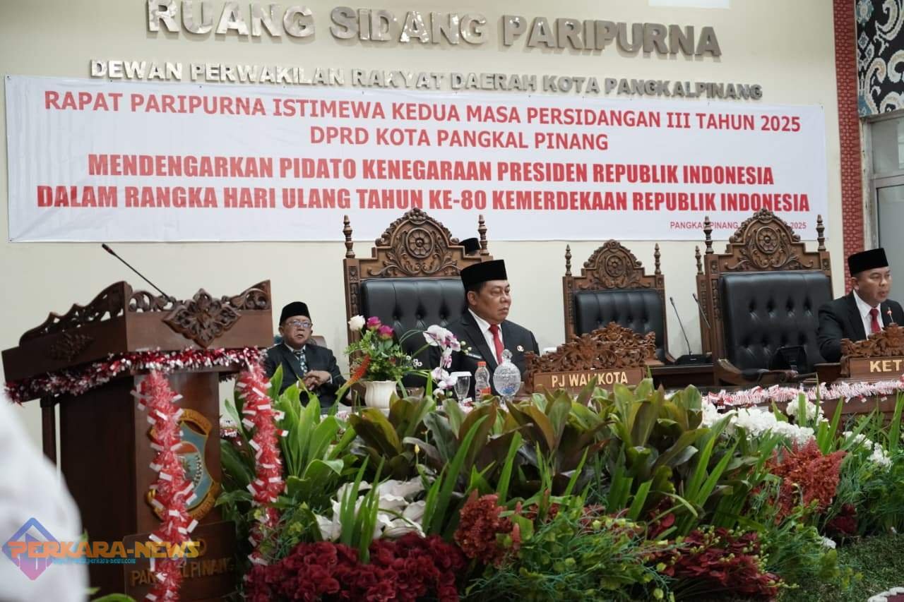 PANGKALPINANG,PERKARANEWS – DPRD Kota Pangkalpinang menggelar Rapat Paripurna Istimewa Kedua Masa Persidangan III Tahun 2025 dengan agenda mendengarkan Pidato Kenegaraan Presiden RI Prabowo Subianto, Jumat (15/8/2025) di ruang sidang paripurna.