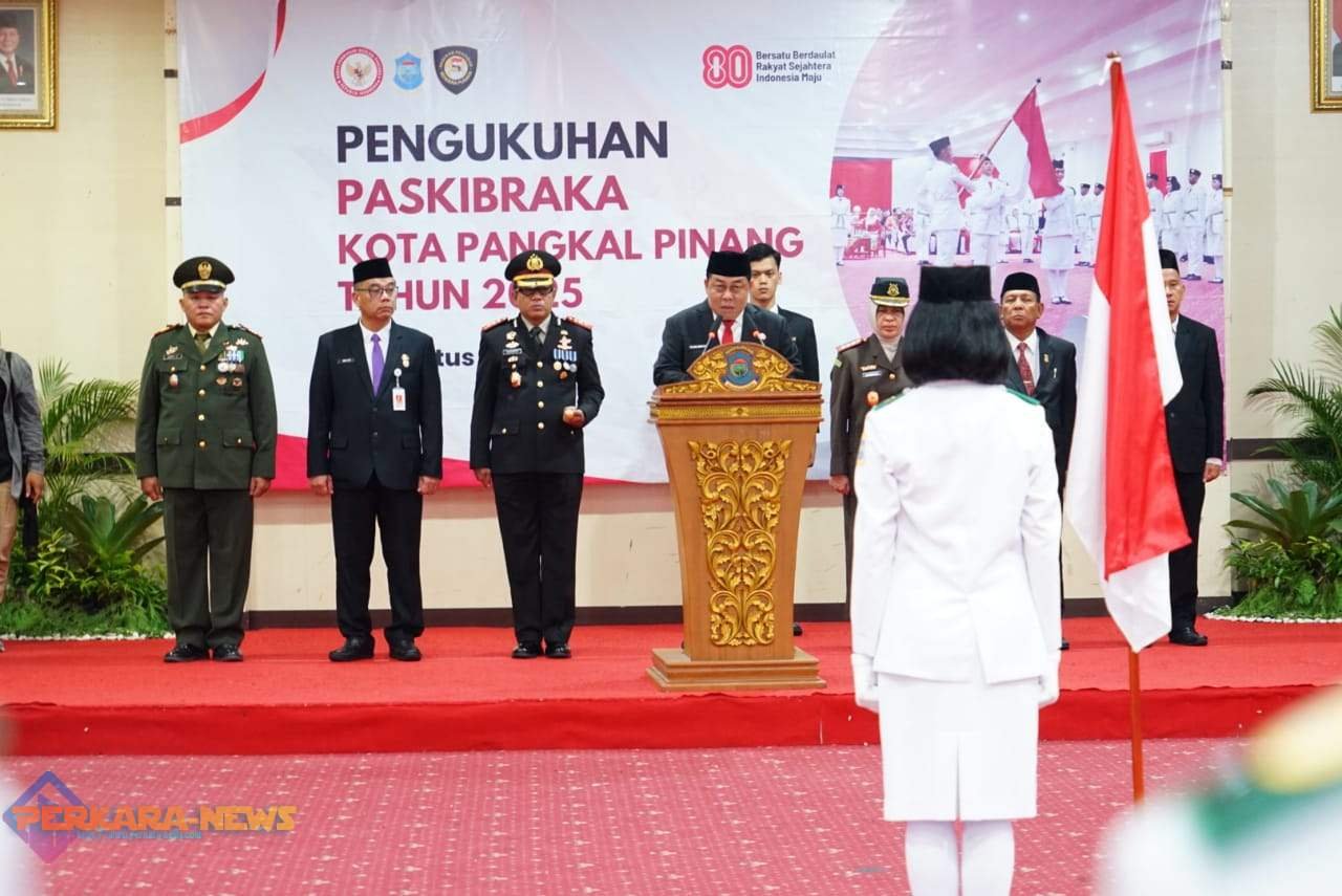 PANGKALPINANG,PERKARANEWS – Pengukuhan Pasukan Pengibar Bendera Pusaka (Paskibraka) Kota Pangkalpinang Tahun 2025 digelar di Balai Betason, Kantor Wali Kota Pangkalpinang, Jum’at (15/8/2025) malam.