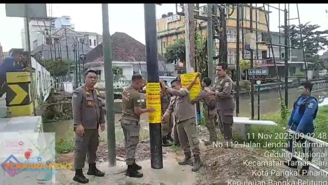 PANGKALPINANG, PERKARANEWS.COM – Babak baru penertiban aset ilegal di Kota Pangkalpinang kembali bergulir. Setelah sekian lama menjadi sorotan, Satuan Polisi Pamong Praja (Satpol PP) Kota Pangkalpinang akhirnya bertindak tegas, menyegel dua tiang papan reklame yang kedapatan berdiri secara ilegal di kawasan strategis, tepatnya di belakang Hotel Puncak, Jalan Jenderal Sudirman.