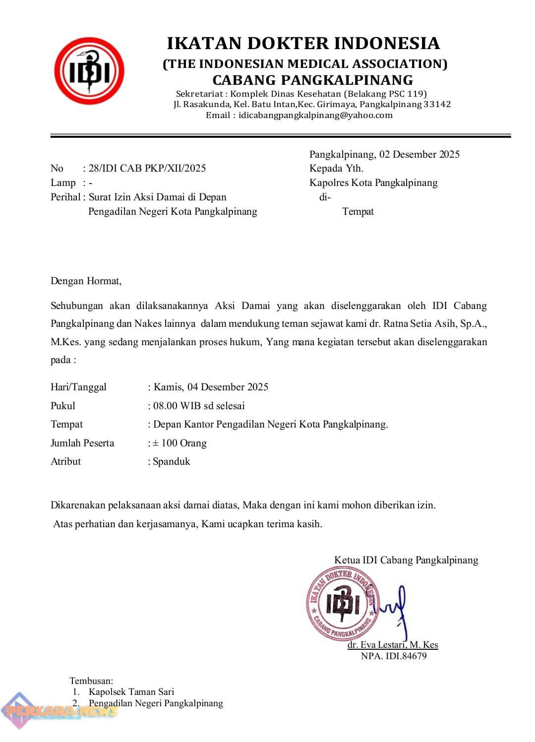 PANGKALPINANG, PERKARANEWS.COM – Arena hukum Kota Pangkalpinang bakal memanas! Ikatan Dokter Indonesia (IDI) Cabang Pangkalpinang secara resmi mengumumkan rencana aksi damai besar-besaran di depan Pengadilan Negeri (PN) Kota Pangkalpinang pada Kamis, 04 Desember 2025.