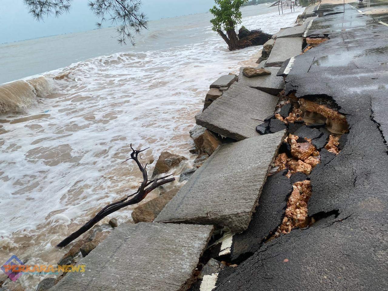 Ditemukan rongga raksasa (void) di bawah lapisan aspal, membuktikan bahwa pemadatan tanah (subgrade) dilakukan dengan kecerobohan yang tak termaafkan. Tanpa adanya seawall atau proteksi gelombang yang memadai, air laut dengan mudahnya “memakan” material jalan hingga konstruksi tersebut menggantung di udara sebelum akhirnya roboh total.